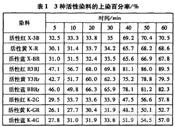 用3种类型的活性染料按1.2.2节染色工艺分别对丽赛纤维进行染色,分别在染色过程中的不同时刻测定上染百分率,结果如表1所示。