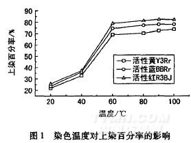 分别采用活性红R3BJ、活性黄Y3和活性蓝BBRr 3种中温型活性染料,在不同温度下对丽赛纤维进行染色50min,染色结果见图1。