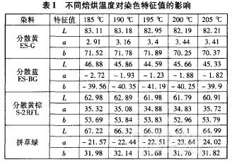 选择焙烘时间60s,选取不同的焙烘温度对分散黄Es—G、分散蓝ES—GB、分散黄棕S-2RFL及拼染草绿色分散染料进行试验,焙烘后在75%硫酸中烂棉取涤纶,并进行不同焙烘温度下染色布样特征值的测试,结果见表1。