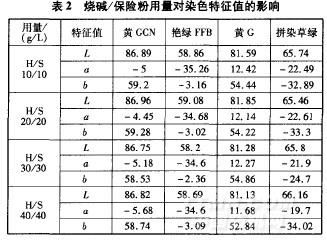 还原染料只有在含烧碱和保险粉的还原液中,才能被还原成对纤维具有亲和力的溶解性隐色酸钠盐,所以还原染料的上染率对烧碱、保险粉用量的依赖性很大。烧碱和保险粉用量必须适当,过多或过少都会影响还原染料的上染,造成色差。试验采用不同烧碱/保险粉(H/S)用量对单色还原染料染色及拼染草绿色,结果见表2。