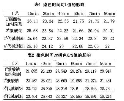 光在增强,随着时间的延长颜色波动较大,色相不稳定。3 工艺随着固色时间的延长红蓝光在减弱,绿黄光在增强,但随着时间的增加颜色波动较小,色相较稳定。同l 纯碱加匀染剂的结果趋势较一致。