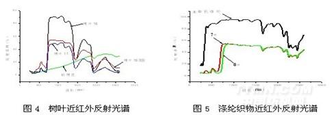 从图4可以看出,不同树叶在近红外波段(700~2600nm)都具有非常相似的反射光谱,而且树叶正、反面的反射光谱也是不相同的,这是因为树叶中都含 有叶绿素成份,但树叶正、反面结构有所不同。变化比较明显的是在680~760nm,反射值急剧增大,不同树叶的反射值大小有所不同,试样11(树叶1, 针树叶)反射值约在45%左右,而试样15(树叶5,阔叶林)反射值却高达85%,变化幅度在40~87%之间。760~1300nm反射曲线基本上没有 大的变化,只在980nm和1187.5nm处有两个不十分明显的反射谷。此外,在1445nm和1930nm处有两个明显的反射谷,但不同树叶吸收能力 也不相同。从图4中还可以看出,树皮的反射光谱与树叶有着本质的区别(此处选用的是暗灰色杨树皮),这是因为树皮与树叶构成不同。