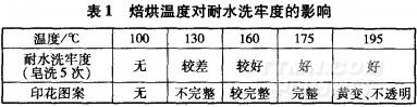 FS4l7S是热反应型产品,焙烘温度对其耐洗牢度有影响。焙烘温度过低,FS4l7s的环氧基团与织物上活泼基团反应不彻底,耐水洗牢度变差;焙烘温度过高,会使Fs417s裂解、黄变,透明度变差。选择合适的焙烘温度十分重要(见表1)。