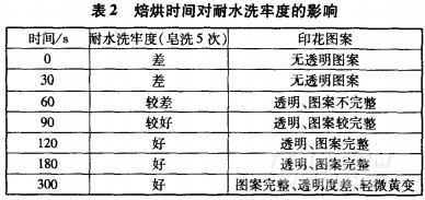 焙烘时间对印花效果也有影响。焙烘时间短,FS-417s的反应基团与织物上的活性基团反应不彻底,结合牢度差,皂洗牢度降低;焙烘时间过长,造成不必要的能源浪费,增加生产成本,降低生产效率,同时导致织物轻微黄变(见表2)。