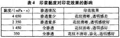 透明印花浆FS417s的黏度,是影响色浆渗透性和上浆量的主要因素。水溶性醇类等溶剂可以降低FS_417s的黏度,促进透明印花浆的渗透,提高透明度。但黏度过低会造成印制图案渗化,降低一等品率。增稠剂Fs-200是印花浆FS417s专用增稠剂,可在不影响透明效果的前提下提高印浆黏度。根据不同织物的特点,将Fs4l7S调至适当黏度,才能达到最佳的透明印花效果(表4)。