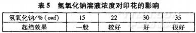 用FS_417s印花后的织物浸轧氢氧化钠溶液,可以获得透明起绉印花和透明泡泡纱加工效果。浸轧碱液和轧碱后的堆置,目的使织物充分定形,达到最佳的起绉和起泡效果。轧碱量大,可使棉织物未印花部分充分收缩、定形,而使印花部分起绉、起泡更加明显,凹凸感更强(表5)。