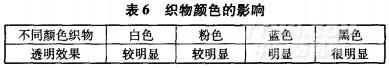 采用FS4l7S,以相同的印花工艺(平网印花)在不同颜色的织物上印花,发现透明效果有一定差异。色泽深的织物透明效果较白色织物好,特别是黑色织物经碱缩后,起绉透明感更强,透明效果更好。这是由于深色织物与白光(太阳光)对比度大,印制后的图案与基布差异明显,透明效果更加明显(表6)。
