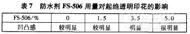 在透明印花浆FS_417S中添加防水剂FS.506,对起绉透明印花有明显的影响。防水剂Fs.506在加热交联后,具有极强的防水、拒水性能,使FS_417S具有更强的定形、保形作用,印花部分不受碱的影响,使印花部分不收缩,而不印花部分收缩,从而形成凹凸感、镂空感更强的透明花纹,更富艺术效果(表7)。