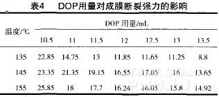 由表4可知,随着DOP用量的增加,成膜的断裂强力有下降的趋势,这是因为在PVC大分子中加入一定量的增塑剂后,增塑剂的内润滑作用减少了PVC大分子内部的作用力,增加了分子链的柔性,但是增塑剂也会使大分子中的连接点溶剂化后分开,减少了分子间的次价键力,因而增塑剂的用量增加会大大降低分子间的作用力,强度也就相应的降低。