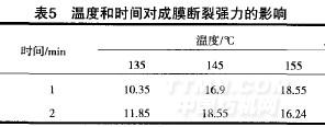 选用三组不同温度,在热处理时间为2min的条件下,用强力测试仪对7组不同增塑剂DOP用量的油墨成膜强力进行测试,所得结果如表4所示。
