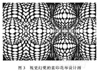 相对中国传统图案悠久的历史,蓝印花布的成长和成熟期比较晚,明显借鉴传统吉祥图案的叙事、象征题材,但在当代纺织品设计中,图形的象征意义正在减弱。蓝印花布图案创新有必要嫁接新的题材,迎合流行审美需要。几何图案是现代设计中的典型元素,体现了现代工艺的简洁特征,通过计算机成形和激光切割,把传统手工无法企及的平面几何构成精确地运用到纸版设计上,可以设计出具有欧普艺术风格的视觉幻觉的蓝印花布,见图3。