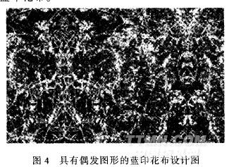 蓝印花布图案体现出拙朴犷野、细致精巧、爽朗秀丽、平静悠远的意韵,其典型稳定在某种意义上限制了后续产品的开发思路。今天,图案意韵协调于流行风格已成为设计界的共识,而流行变化加速已成为不可逆转的趋势,所以,蓝印花布的图案意韵要积极求变。在后现代主义思潮中,随机、任意的色彩图形得到进一步重视。借鉴后现代艺术观念技巧如抽象表现主义,直接把拔色浆料自由洒落在深色面料上,达到偶发性的拔色效果,或用水“射击”涂布防染浆料的面料,形成偶发的防染状态,都能够得到视觉动感更突出的偶发性色彩效果。图4是以偶发性意味强烈的抽象表现主义技巧创造的具有偶发图形的蓝印花布。