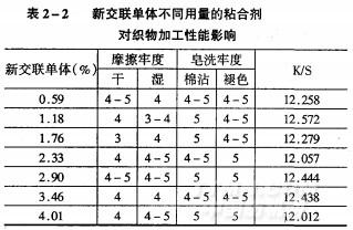 如表2—2所示,选择新交联型单体用量为单体总质量2.9o%时,使用该粘合剂制成的印花糊,加工织物的摩擦牢度和皂洗牢度都优良于其它,K/S值也比其它高。故采用此用量交联单体可以获得很好的印花织物粘合剂。