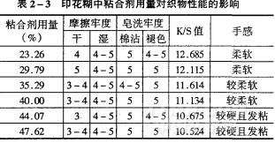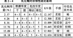 过多的乳化糊首先在调浆时发生困难,色浆很稠,搅匀困难。在印花的时候较稠的印花色浆无法顺利通过网孔,导致织物印色不匀,整理过的织物手感也很差。由表2—4可以确定,选择乳化糊的用量为总色浆质量的4.26%。