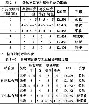 交联剂含有两个或两个以上官能团,对非反应粘合剂起着极大的作用,而在本身可自交联的粘合剂中加入少许,也可以使交联效果更好,本实验选择的外加交联剂为高反应性交联剂,遇水即可发生反应,故在调浆完成以后印花之前加入数滴,搅匀即可印花。使用以上优化的印花工艺进行印花。,如下表2—5可以看出交联剂的加入可以提高摩擦及皂洗牢度,对K/S值影响不大值,但用量过多使织物手感变硬,而且会增加工业生产成本,所以选择外加交联剂用量为3滴,质量约0.15g。