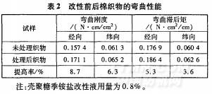 为了考察壳聚糖季铵盐改性处理前后喷墨印花织物的手感变化,测试了织物的弯曲刚度和弯曲滞后矩的变化。