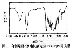 如前所述,本试验自制的聚醚/聚酯(非离子)耐久型涤纶织物亲水抗静电剂PEE,是聚对苯二甲酸乙二酯和聚对苯二甲酸聚乙二醇酯(包含聚醚链段)的嵌段共聚物,其红外光谱见图1。