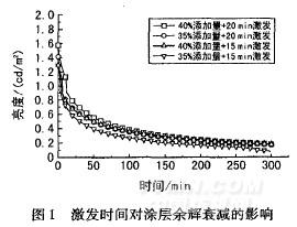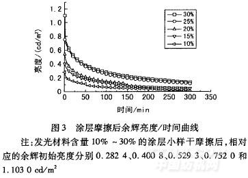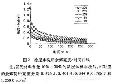 (1)夜光涂层余辉初始发光亮度随发光材料添加量的增加而增大,但增加到一定程度,在相同的激发条件下,亮度趋于平缓。