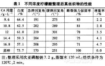 从表1数据发现,当柠檬酸用量超过l2g/L后,织物的折皱回复角有所减小,而白度随柠檬酸用量的增大明显减小,断裂强力随柠檬酸用量的增大而减小。综合考虑整理后真丝织物的抗皱性、强力及白度值,柠檬酸浓度选择12g/L可以兼顾各方面的性能要求。