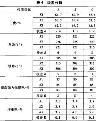 从表4看出,影响白度性能的因素顺序是:水解时间>丝素整理剂用量>氢氧化钠用量,最佳组合水平为A1B3C2,即水解时间10min、丝素整理剂用量40g/L、氢氧化钠用量3g/ L;影响急弹回复率性能的因素顺序是:氢氧化钠用量>水解时间>丝素用量,最佳组合水平为,即水解时间30min,丝素整理剂用量30g/L,氢氧化钠用量3g/L;影响缓弹回复率性能的因素顺序是:氢氧化钠用量>水解时间>丝素用量,最佳组合水平为A2B2C2,即水解时间30min,丝素整理剂用量30g/L,氢氧化钠用量3g/L;影响断裂强力性能的因素顺序是:丝素用量>氢氧化钠用量>水解时间,最佳组合水平为A1B3C1,即水解时间lOmin,丝素整理剂用量40g/L,氢氧化钠用量1g/L;影响增重率性能的因素顺序是:丝素用量>水解时间>氢氧化钠用量,最佳组合水平为:A2B3C2,即水解时间30min,丝素用量40 L,氢氧化钠用量3g/L。可见,影响5个指标的因素顺序和最优方案不同,需采用综合平衡方法。