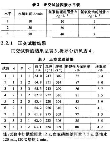 选择丝素水解时间、丝素整理剂用量、氢氧化钠的用量设计(3)正交表进行试验。整理后的试样分别进行白度、急弹回复角、缓弹回复角、断裂强力、增重率的测试(见表2)。