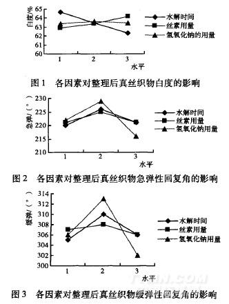 各因素的3个水平对白度、回复角、断裂强力保留率和增重率的影响见图1—5。