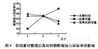 (3)氢氧化钠用量C对各指标的影响:随着氢氧化钠用量的增加,白度基本保持不变,急弹与缓弹先增后减,断裂强力随之减小,增重率先增后减。结合表3分析,对急弹、缓弹回复率,氢氧化钠用量的影响最大,取水平2最好;对断裂强力来说,氢氧化钠用量影响适中,可取水平1。氢氧化钠用量对白度、增重率的影响最小,取水平2。随着NaOH质量一体积分数的增加,被整理织物的急弹和缓弹先增大后减小。当NaOH为3g/L时,织物的折皱回复角最大,超过3g/L时折皱回复角开始减小。这是因为NaOH的质量一体积分数过大时,丝素水解加快,丝素分子量过小,浸轧时与蚕丝纤维的吸引力减小,能附着在纤维上的丝素分子减少,经过焙烘与纤维发生的交联也大大减少。而在NaOH质量一体积分数适宜的情况下,丝素分子被分解成的多肽分子的大小也适宜,这不仅有利于渗透到蚕丝内部的空隙中,均匀分布于织物内,焙烘后更有利于交联。综合各项因素,NaOH质量一体积分数以3g/L为宜。综合考虑,氢氧化钠用量取水平2,即3g/L为好。