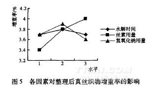 (2)丝素整理剂用量对各指标的影响:随丝素整理剂用量增加,白度略有提高,急弹与缓弹先增大后有所降低,断裂强力和增重率随之增加。结合表4看出,对断裂强力与增重率,丝素用量的极差最大,取水平3最好;对白度,丝素用量影响适中,取水平3最好;对急弹与缓弹来说,取水平2或3均可。织物的急、缓弹折皱回复角随着丝素整理剂用量的增加而增大,到30g/L时达到最大,4Og/L时有所降低。这是由于丝素整理剂用量过大时,大部分丝素分子只能附着在纤维表面,只有一部分分子进入蚕丝纤维内部的缝隙中。随着丝素溶液用量的增加,纤维间的黏附力及交织点的黏结作用增强,折皱回复性有所下降,手感变硬。对于白度、断裂强力、增重率3个性能来说,丝素用量取40 L最好,综合考虑5个指标,丝素整理剂用量取40g/L较好。