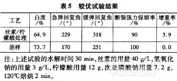 经A2B3C2较优工艺整理后的真丝织物与未处理的性能对比如表5。当丝素整理剂和柠檬酸复合整理时,它能在纤维和整理剂之间形成一定的交联,提高真丝织物抗皱性的同时,有效地保持其断裂强力和白度。
