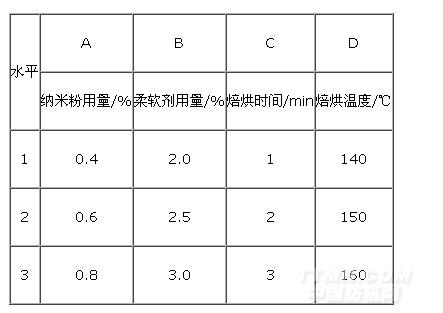 在上述单因素分析基础上,以纳米材料用量、有机硅柔软剂用量、焙烘温度和时间这4个因素设计正交实验,以确定出最优的实验工艺,结果如表3、表4所示。