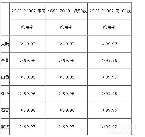 用奎因氏法测定洗过不同次数抗菌样品对大肠杆菌、金黄色葡萄球菌、白色念珠菌、红色毛癣菌、石膏样小芽胞菌、絮状表皮癣菌的抑菌效果: