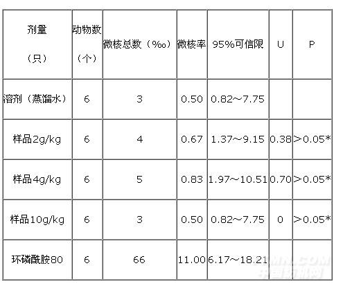 4.2.3.1试验方法:依据GB7919-87试验方法进行小鼠骨髓嗜多染红细胞微核试验。