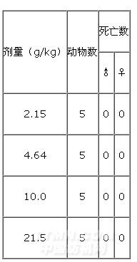 4.2.4.1试验方法:试验动物为中国医学科学院动物中心提供的二级昆明种小鼠(合格证号为医动字第01-3001号),雌、雄各20只,体重为18-22克,按霍恩氏法选用经口一次灌胃染毒,给药前12小时禁食,给药量最大体积为0.4ml/20g体重。染毒后观察二周,记录中毒症状及死亡时间,根据动物死亡数,从霍恩氏LD50计算表,求出LD50值及可信限。