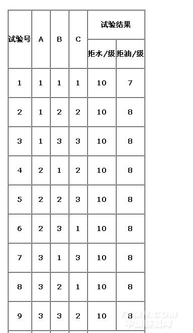 选择影响织物拒水拒油整理效果的三个主要因素:整理剂用量、焙烘温度和焙烘时间,进行3因素3水平正交试验[L9(33)],测试了拒水和拒油等级。根据极差分析得出HSll00整理剂对芳砜纶织物拒水拒油整理的优化工艺条件[1]。