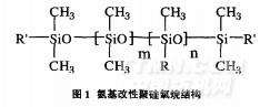 氨基改性有机聚硅氧烷之所以具有如此优良的性能,这得益于其分子链结构(如图1,R为伯氨基、仲氨基、叔氨基、芳氨基或同时含伯氨基和仲氨基,R为-CH、一OH、-OCH,等)。聚硅氧烷以硅氧键(si一0)为骨架,其键能很大,达到451kJ/tool,使硅氧烷的热稳定性很好;Si—O—Si的键角很大,使si一0之间容易旋转,分子链具有极佳的柔软;Si一0键长较长,使得键对侧基转动的位阻小;聚硅氧烷侧基为甲基,si—c键键能较大,为368kJ/mol,对聚硅氧烷的稳定性有贡献;另外由于si—O间d'rrp,rr键的相互补偿和Si一0偶极间的相互补偿,使聚硅氧链形成螺旋结构,每个螺环由6个左右的硅氧链节构成,甲基向外起屏蔽作用。这样的结构使硅氧链间相互作用力小,分子体积大,表面张力小;并且聚硅氧烷大分子表面上大量氨基的存在,使其极易与纤维表面的羟基、羧基等极性基团结合形成氢键,从而使氨基改性聚硅氧烷分子吸附在纤维表面,赋予纤维优良的性能。