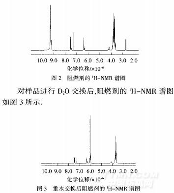 由图2、图3可知,以CDCL为溶剂,测试样品经D2O交换后,9.28、2.74处的2个端一0H活泼氢吸收峰均消失,且在6.05处增加了D2O的吸收峰.测试结果进一步说明合成的阻燃剂为目标产物.