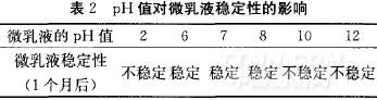 pH值可影响ASO一121微乳液的带电性能,亦即∈电位,因而对ASO一121微乳液的稳定性有一定的影响(见表2)。