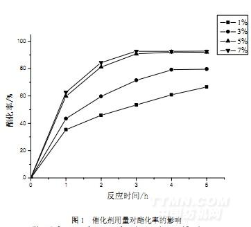 酯化反应是一个可逆反应,一般反应速度慢,达到酯化反应平衡所需时间长,因而反应需要加入一定量的催化剂,以提高反应速度,缩短反应达到平衡的时间。实验选择对甲基苯磺酸作催化剂,通过对体系酸值的测定,考察了催化剂用量对酯化率的影响,结果如图1所示。