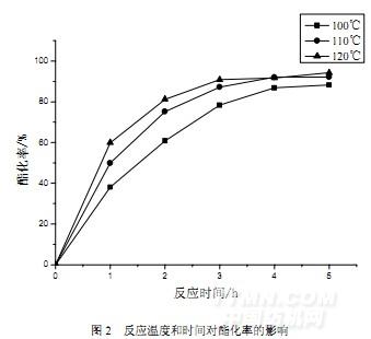 聚醚硅油与丙烯酸的酯化反应,温度是较为重要影响因素之一。实验考察了不同反应温度条件下,反应时间对酯化率的影响,结果如图2所示。