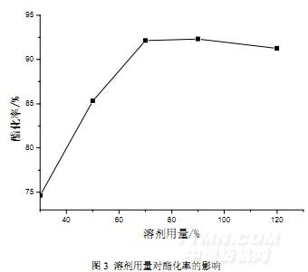 由于聚醚硅油具有一定的粘度,影响其反应基团羟基与丙烯酸分子上的反应基团羧基的150接触,而加入适合的溶剂可以降低反应物的粘度,提高反应性基团——羟基和羧基的接触几率。此外,酯化反应还会产生少量的水,为使产生的水能够迅速脱离反应体系,还需加入一定量的携水剂。为此,实验选择兼具有溶剂和携水剂功能的甲苯作为溶剂,研究了甲苯溶剂用量对反应酯化率的影响,结果如图3所示。