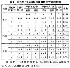 选择三种颜色较深、牢度较差的棉针织物作为研究对象,考察固色剂TF一234B的用量对固色效果的影响,结果见表1。