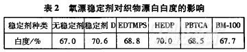 由表2可以看出,加人稳定剂D、EDTMPS和HEDP的试样白度较高。这是由于漂液中加入这3种稳定剂之后,双氧水的分解速率得到了有效控制,双氧水在总的漂白时间内保持了较高的氧化能力。虽然稳定剂HEDP对双氧水的稳定性较差,但漂白后试样白度较高。这主要是由于HEDP本身酸性较强,在调节工作液pH值的过程中加入大量碱剂所致。综合考虑,在后续试验中选择稳定剂D作为氧漂稳定剂,其质量浓度为2g/L。