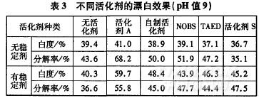 由表3可以看出,在80oC、pH值9且无稳定剂的条件下,除活化剂s以外,其它几种活化剂对双氧水的分解均有较明显的促进作用。从白度上看,与空白样相比,仅有活化剂A对织物的白度有一定的提升;而活化剂NOBS、TAED和活化剂S的加入,都使织物白度有一定的下降。因此,漂白条件为80℃、pH值9时选用活化剂A。但是活化剂A对双氧水分解率的提高程度远远大于对白度的提高程度,这可能是由于1.2X10-3g/L的质量浓度对活化剂A来说已经过量,导致双氧水分解迅速。