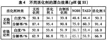 由表4可以看出,不加入稳定剂时,在8O℃、pH值11条件下,不论是否加人活化剂,试样均有较高的双氧水分解率,达到85%以上。而当漂液中加入稳定剂以后,织物白度明显提高,双氧水的分解得到了有效控制,漂白能力提高。从表4还可以看出,活化剂S有更明显的促漂作用,尤其是当加人稳定剂之后,加入活化剂S的试样白度比其它试样要高1O个百分点。因此,漂白条件为80℃、pH值11时,选用活化剂S。