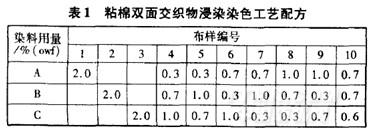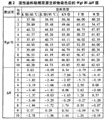 选用的活性染料采用60℃浸染法染色,其中K型染料采用两种工艺(60℃浸染和95℃浸染)染色,按表1所示染料用量染色,然后测试织物的Wgt和△H值,结果见表2。