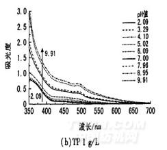 图1(b)中,在中性至碱性条件下,紫外区的吸光度有了一定程度的增加,在可见光区的吸光度增加更显著,出现明显的吸收峰。这主要是碱性条件下茶多酚的酚羟基电离度增加,且被氧化形成醌式结构所致。