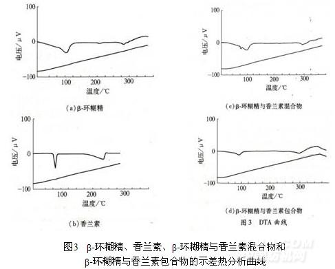 在β-环糊精的DTA曲线上100℃出现加热脱水吸热峰,在300℃左右为β—环糊精熔点;香兰素的DTA曲线在82℃处有熔点吸收峰;β-环糊精与香兰素混合物的DTA曲线上基本上再现了β-环糊精与香兰素的特征峰,可是在β-环糊精与香兰素包合后没有出现香兰素熔点峰,表明香兰素的热稳定性得到了提高。