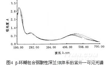 在染料液中加入环糊精后,染料分子的最大横截面尺寸与空腔匹配的染料分子或其部分基团,一旦进入环糊精的疏水性空腔发生包合作用,就可能引起其吸收光谱的变化。这主要是染料分子共轭体系的电子云密度受到了腔中较高电子云的微扰,引起共轭体系电子跃进能降低及吸收强度增加,从而导致吸收光谱的吸收度增强及最大吸收波长的红移。据文献介绍(24)弱酸性深兰5R(C.1、Acid Blue 113)溶液中加入不同量β-环糊精,在60°恒温振荡包合处理后,其紫外—可见光谱图,如图4所示