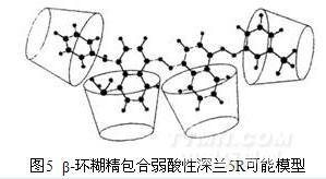 由图4可知:弱酸性深兰5R分子中部分苯环已进入β-环糊精空腔,因受空腔内电子云的影响其吸收强度增加和最大波长发生了红移。根据计算机模拟弱酸性深兰5R的空间结构模型,其两端苯环结构尺寸与β-环糊精空腔尺寸匹配而被合包,由于空间位阻,β-环糊精不能贯串整个染料分子,但对染料中间的两个萘环或许也可能进行部分侧面的包合,因此,β-环糊精对弱酸性深兰5R分子包合,最大可能比为4:1,其模型示意如图5所示