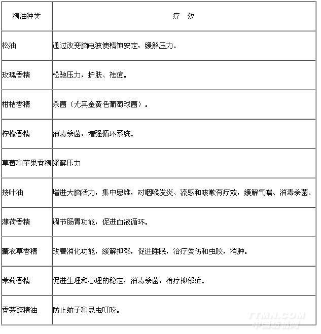 由于工业化飞跃发展,人们对自然界资源掠夺性开采,形成对生态环境的灾难。致使人们不得不开始反思,在回归自然、追求健康的浪潮下,森林浴和芳香治疗悄然成为城市生活一种时尚,各种加香产品的蓬勃兴起也成为一道风景线,顺应这种趋势具有芳香保健功能的纺织品的开发也受到业界同仁们的关注。科学研究表明,许多芳香精油具有镇静、杀菌和保健等作用。人们又进一步发现某些芳香植物精油还具有一定的药用功效,可提供一些生理和心理方面的辅助疗效(52)。如表10所示